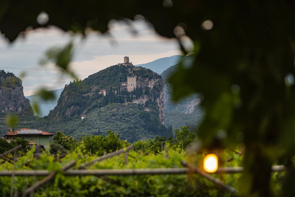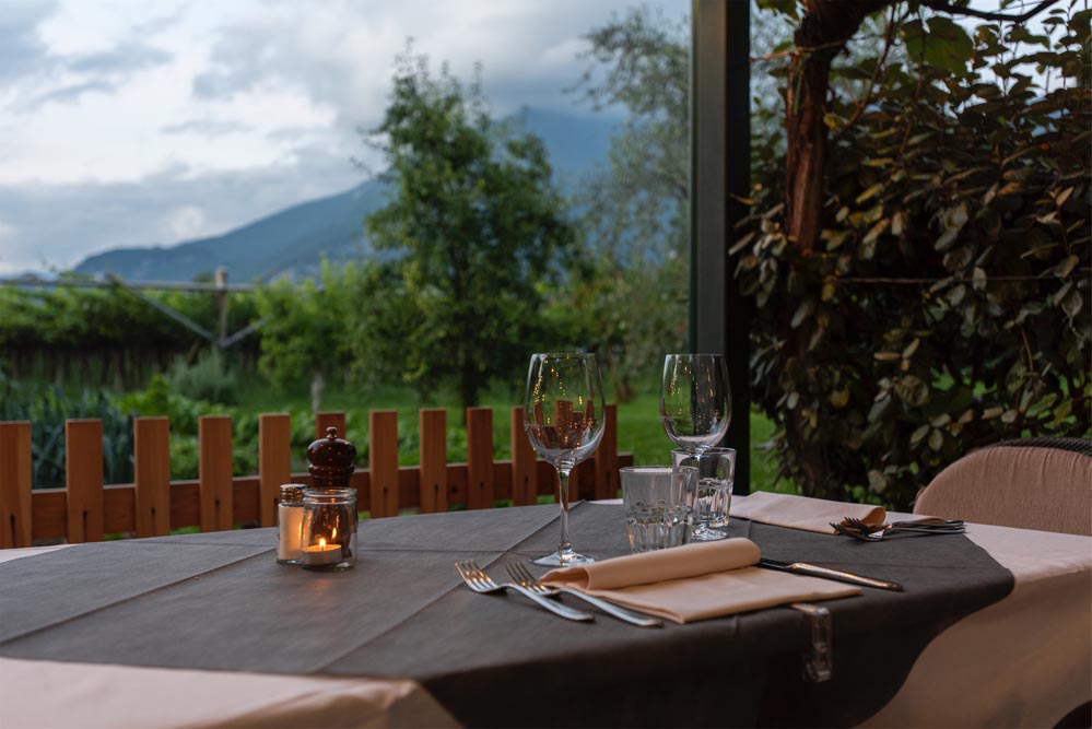 L’esterno, probabilmente lo spazio più scenografico di Osteria Le Servite, è reso unico dalla presenza di un delizioso dehor con vista Castello di Arco. I tavoli sono disposti sotto un pergolato di vite dal fascino senza tempo, circondati da tre ettari di vigneto e un giardino con un piccolo orto.